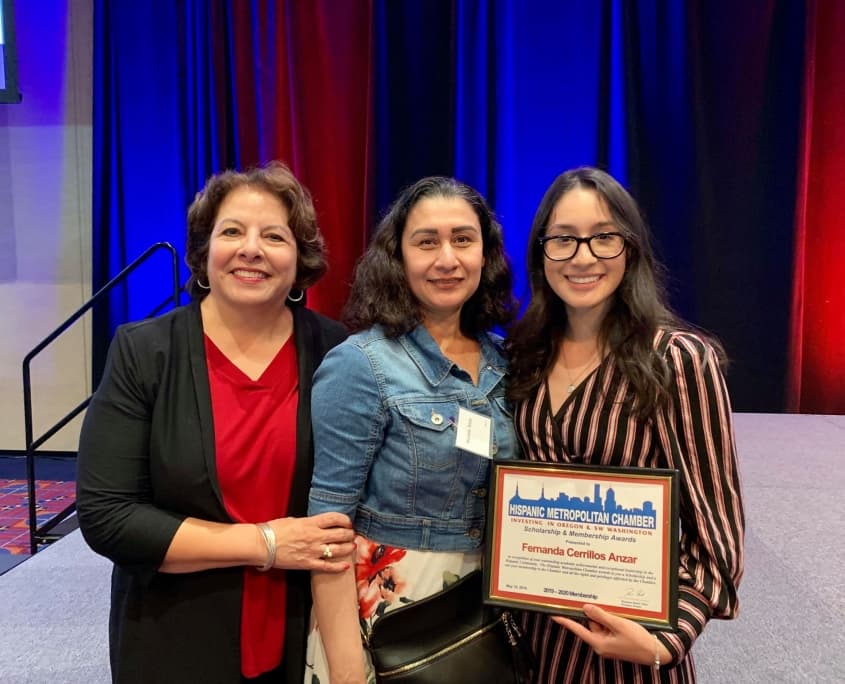 - L to R: Gale Castillo, Interim Executive Director of HMC; Marcela Anzar; and Fernanda Cerrillos Anzar, recipient of 2019 Hispanic Metropolitan Chamber Scholarship Award.